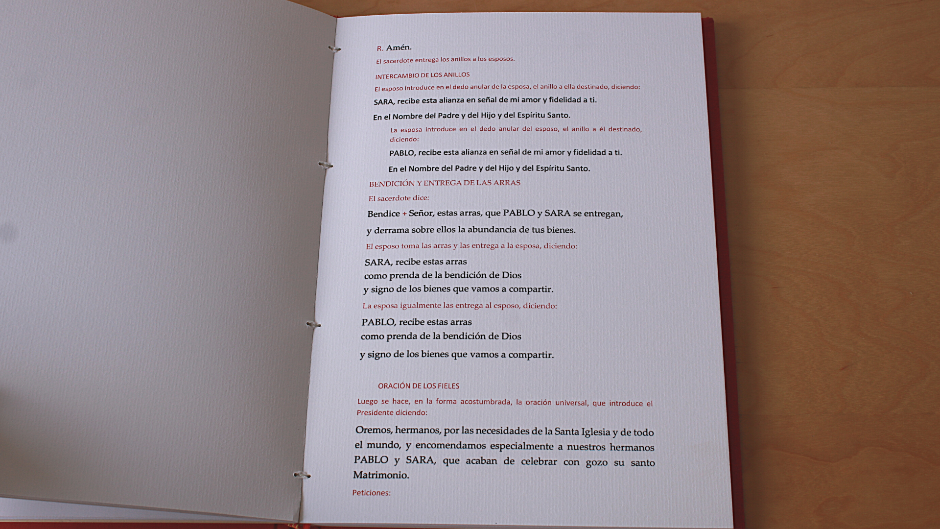 Este paso es opcional, pero nosotros quisimos aunar toda la ceremonia en un solo libro. Como iban a participar varios sacerdotes, nuestros hermanos en las peticiones, los lectores, etc… maquetamos el libro con nuestras lecturas, los cantos y la fórmula del matrimonio que escogimos.