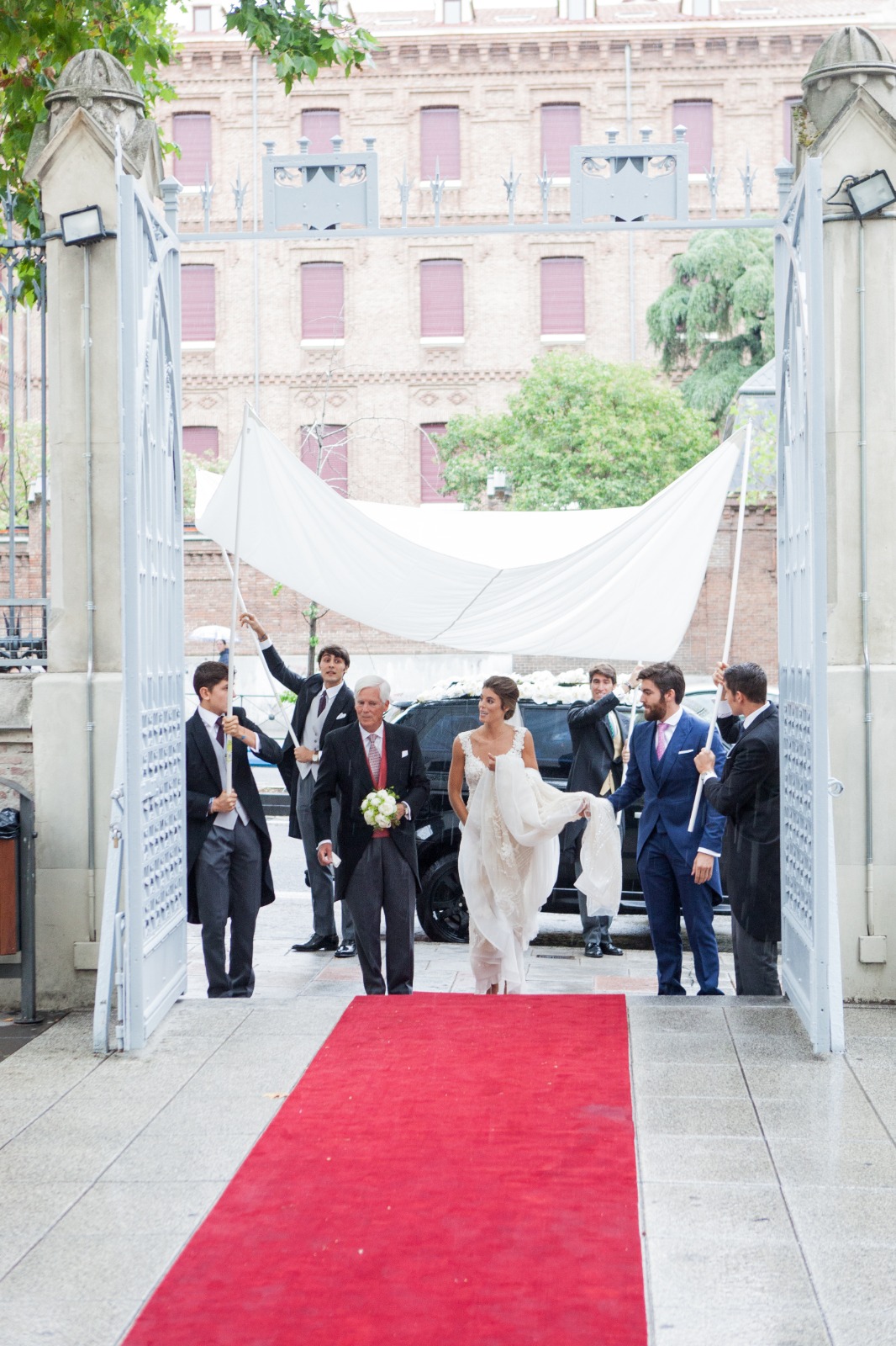 El día anterior, fue a Leroy Merlín, compró 6 postes de madera y una lona blanca. De forma totalmente casera creó un palio para cubrir a la novia. El resultado, lejos de ser cutre, fue una entrada de princesa por todo lo alto.
