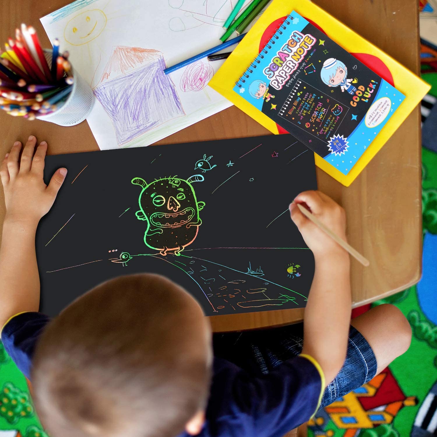 Lo curioso de estos papeles es que son completamente negros y al rascarlos con un lápiz sin mina, aparecen distintos colores debajo.
