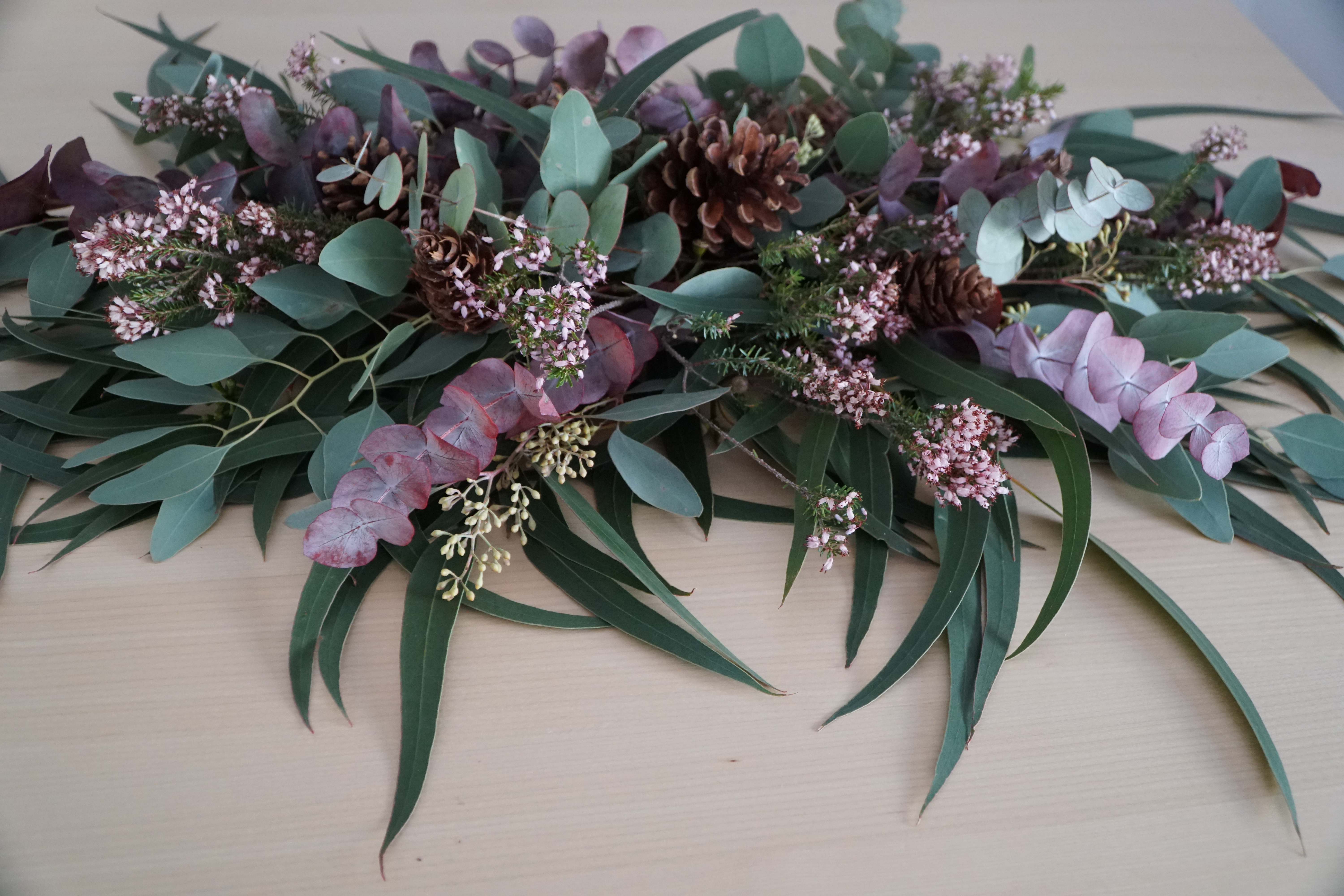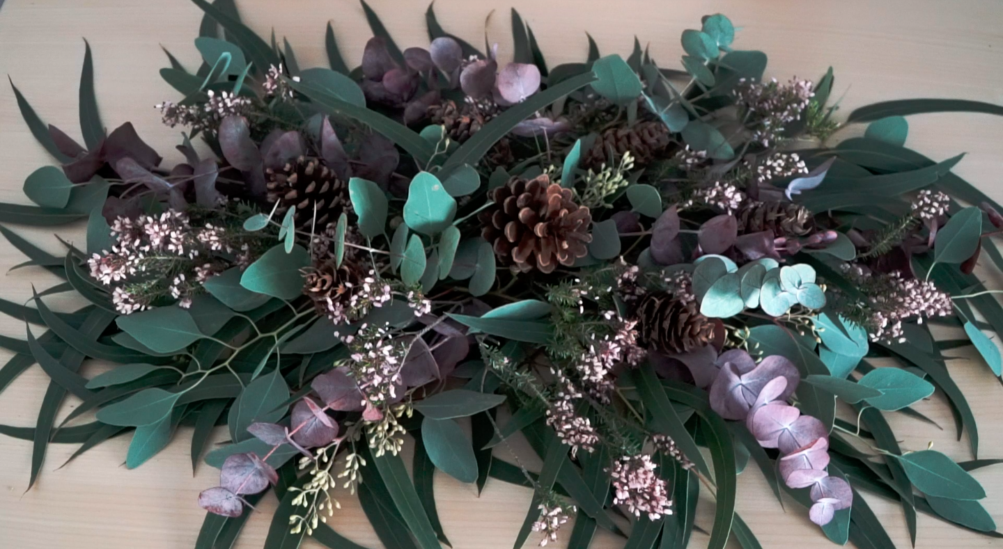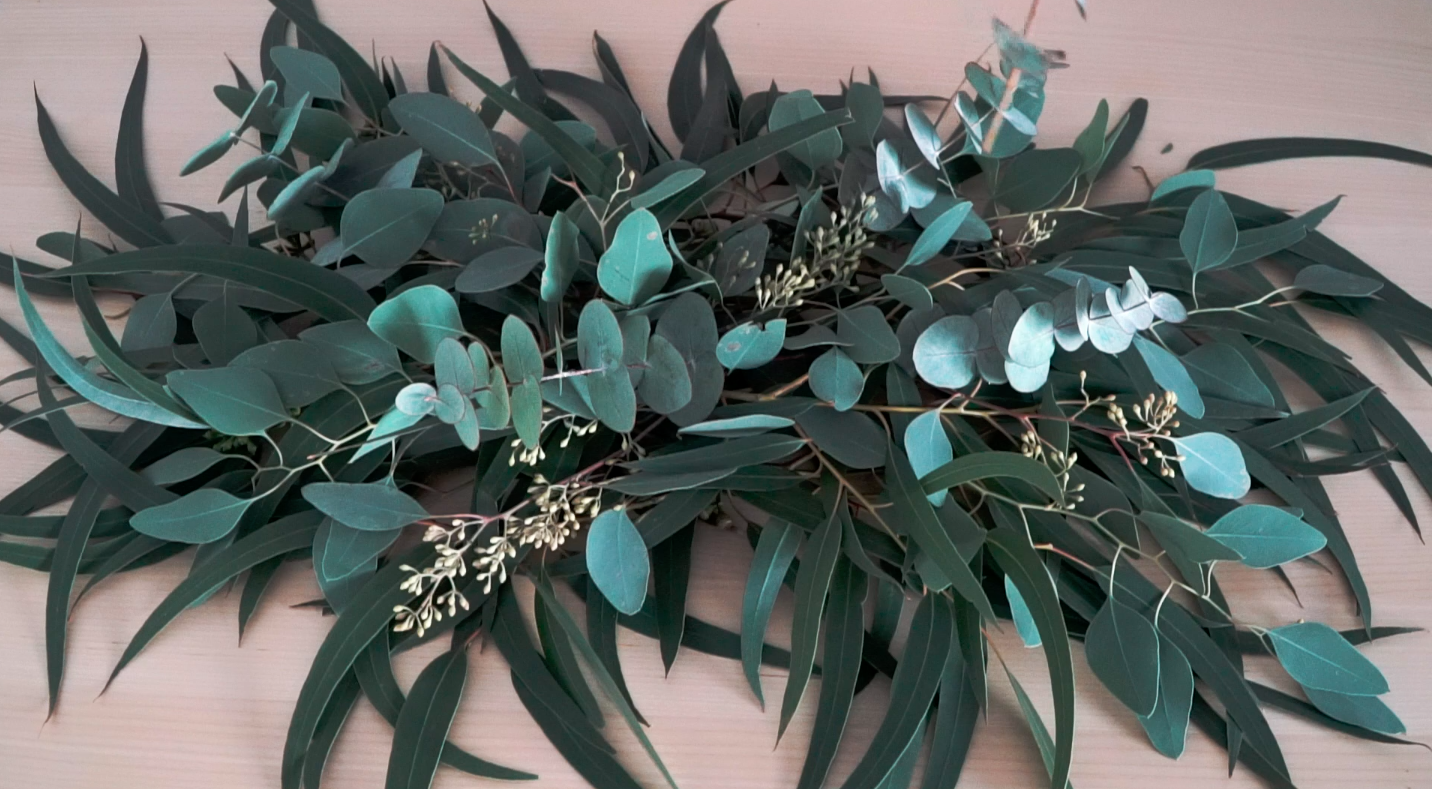 - Hacemos la base con el globulus de hoja larga. Ya sabéis, las ramas más grandes primero. Esta hoja se expande mucho, lo cual es muy bonito porque llena vuestros espacios; pero ¡cuidado!, que no domine la mesa.
