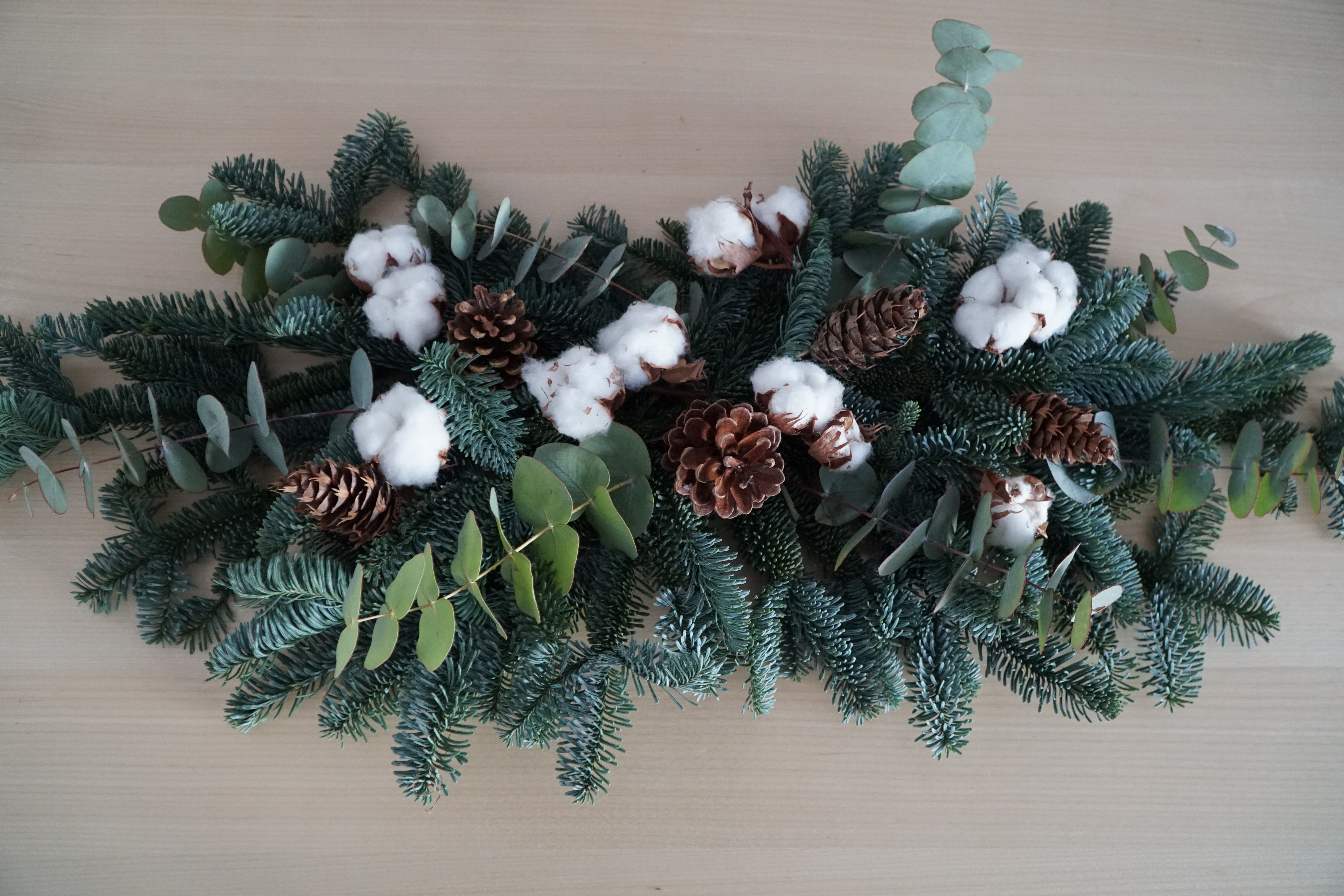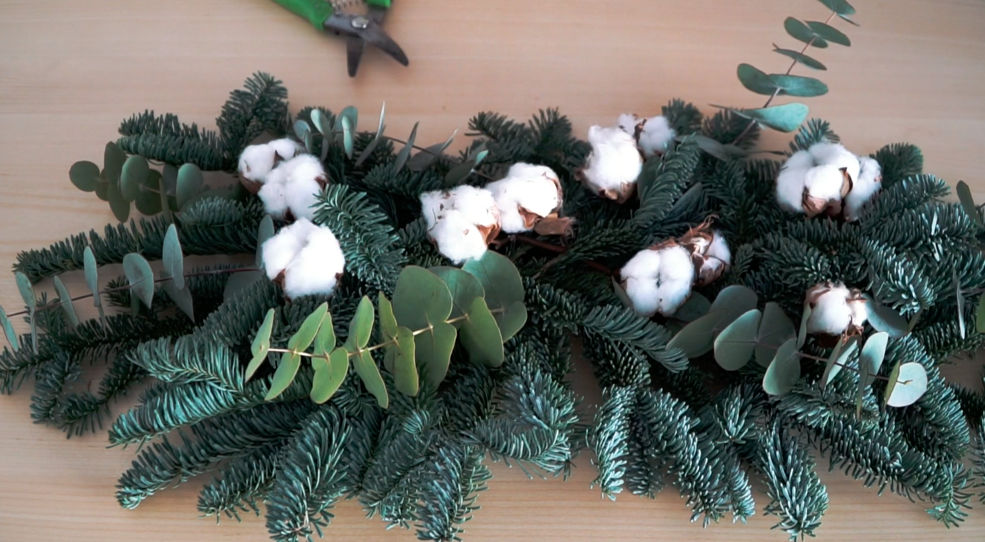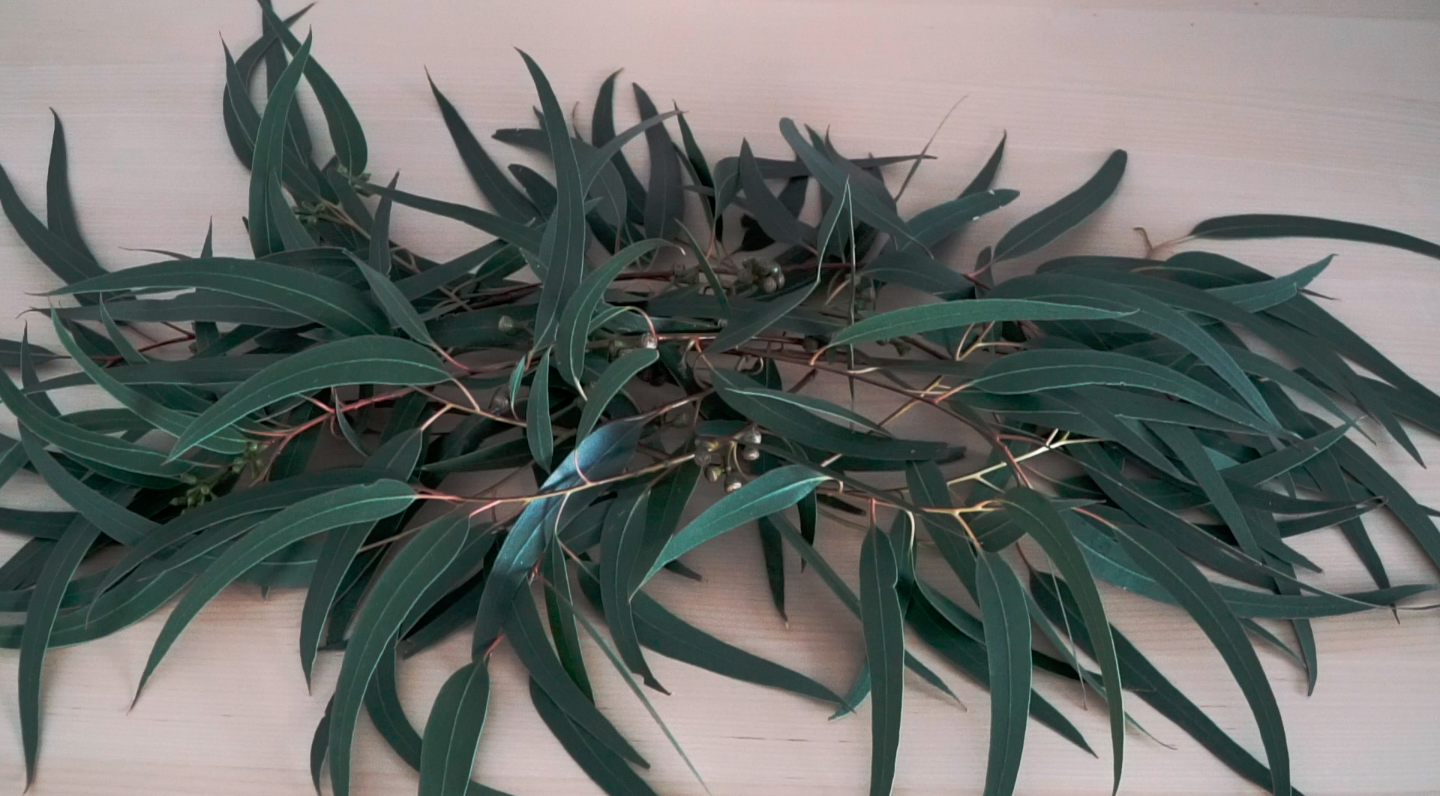 - Hacemos la base con el globulus de hoja larga. Ya sabéis, las ramas más grandes primero. Esta hoja se expande mucho, lo cual es muy bonito porque llena vuestros espacios; pero ¡cuidado!, que no domine la mesa.